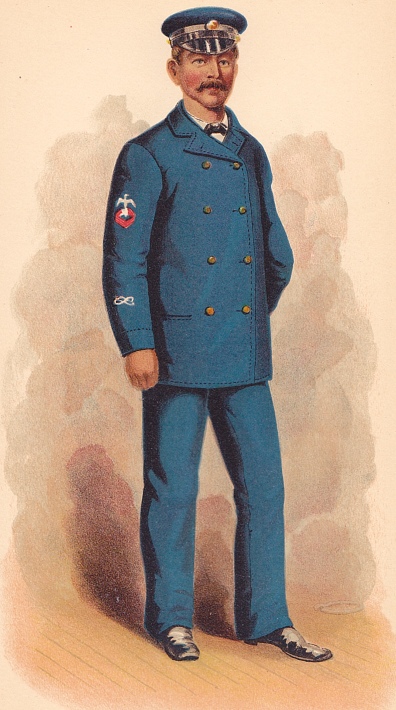 First class petty officers wore double-breasted blue or white coats and visored caps, while lower rates wore standard seaman's jumpers and hats. A single rating badge was worn according to assignment: Sailors assigned to a vessel's port watch wore their badge on the left, and starboard watch on the right. The chevrons were red on all clothing, with white eagle and specialty marks on blue and vice versa. The red chevrons were made of a single piece of cloth and each chevron outlined by black stitching; the chevrons were also padded to stand out slightly. Gold chevrons were authorized for petty officers with three consecutive Good Conduct Medals. Although the regulations don't specify, it is likely that the gold stripes were worn only on the blue coat or jumper, rather than the frequently laundered whites. There are also examples of rating badges on blue cloth with the eagle and specialty mark embroidered in silver, though this was not authorized in the regulations. Petty officers who had qualified as seaman gunners wore a flaming shell mark superimposed on the chevrons.