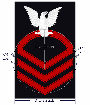 It appears that the new rating badges with chevrons were intended to be comparable in size to the previous eagle and anchor petty officer badge, which was roughly three inches high. The dimensions of the 1886-pattern chevrons were not mentioned in the regulations except for the specialty mark, which was to fit in a one-inch diameter circle. The chevrons of period examples usually measure between 2¼ and 2½ inches wide.